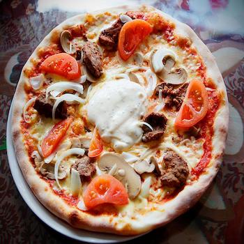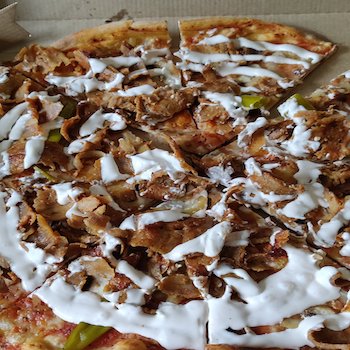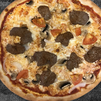 Kebabkött, champinjoner, vitlökssås och feferoni